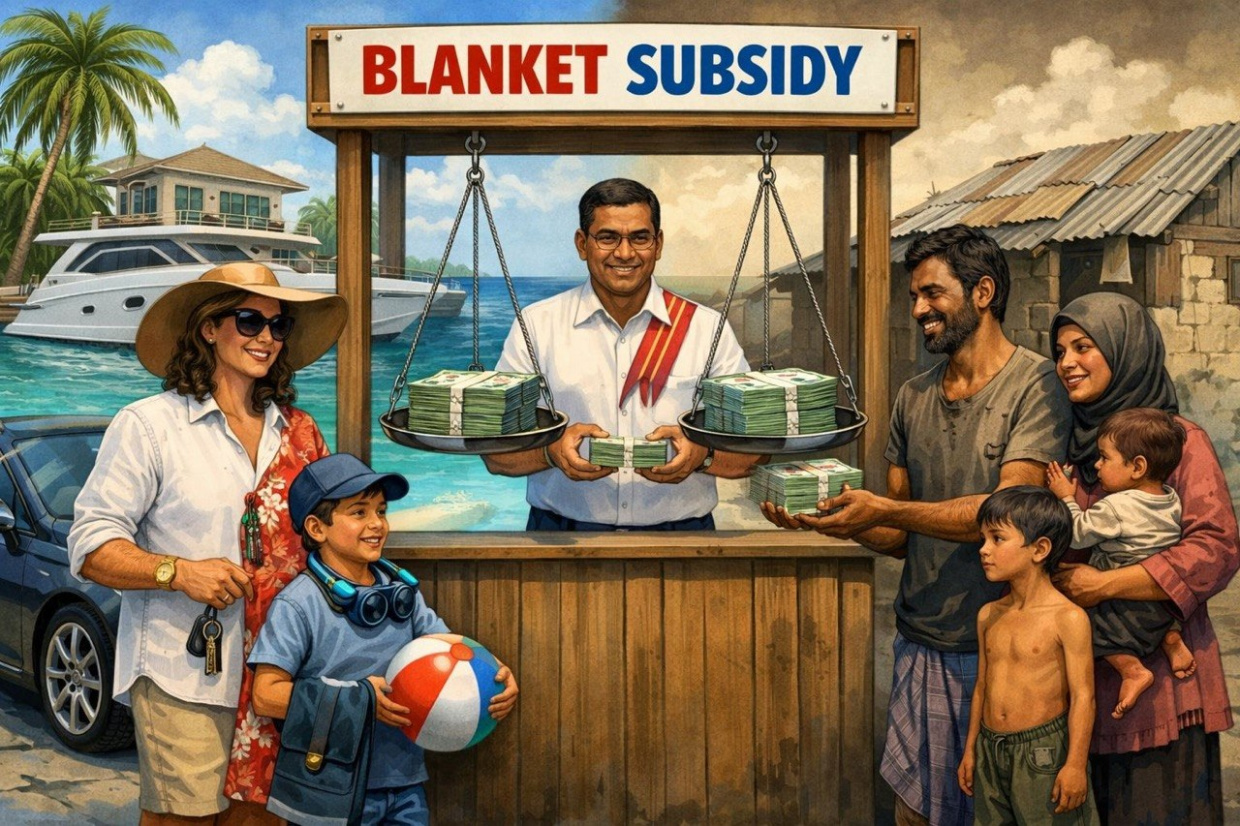 ތަހުޒީބީ މުޖުތަމައުއެއްގެ އަސާސަކަށް ވާންޖެހޭނީ ހަމައެކަނި "އެންމެނަށް އެއްވަރަކަށް" ދިނުމެއް ނޫނެވެ. އޭގެ ބަދަލުގައި، ކޮންމެ މީހަކަށްވެސް އެމީހަކު ހުރި ވަޅުގަނޑުން އަރައިގަނެވޭނެ މިންވަރަށް އެހީތެރިވެދިނުމެވެ. ދިވެހިރާއްޖޭގެ އިގްތިސާދު ހަމަ މަގަށް އެޅުވުމަށްޓަކައި، ބްލެންކެޓް ސަބްސިޑީތައް ހުއްޓާލައި، ހަގީގީ ބޭނުންޖެހިފައިވާ "ރިއަލް ޕީޕަލް އިން ނީޑް" އަށް އިސްކަންދޭ އީކުއިޓީގެ ނިޒާމަކަށް ބަދަލުވުން މިއީ މިއަދު މަޖުބޫރު ކަމެކެވެ. ތަނަވަސް މީހުންނަށް ދައުލަތުން ދޭ ސަބްސިޑީ ކަނޑާލައި، އެ ފައިސާ ނިކަމެތިންގެ ދިރިއުޅުމުގެ ފެންވަރު މަތިކުރަން ހޭދަކުރުމަކީ އަދުލުވެރިކަމުގެ އަސްލެވެ.